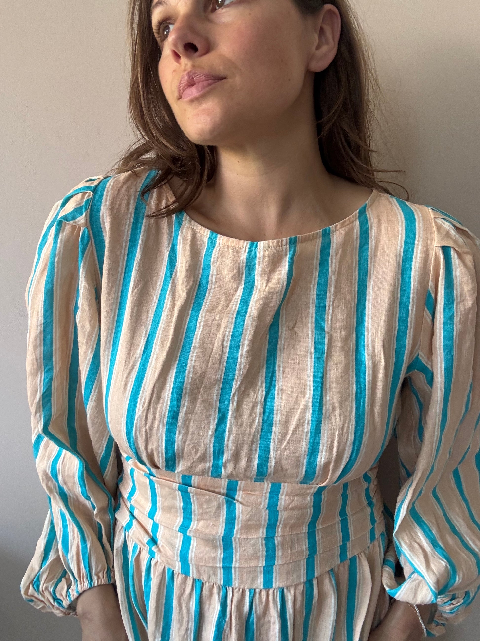 100% linen striped backless dress with baggy sleeves and tie waist size 12
