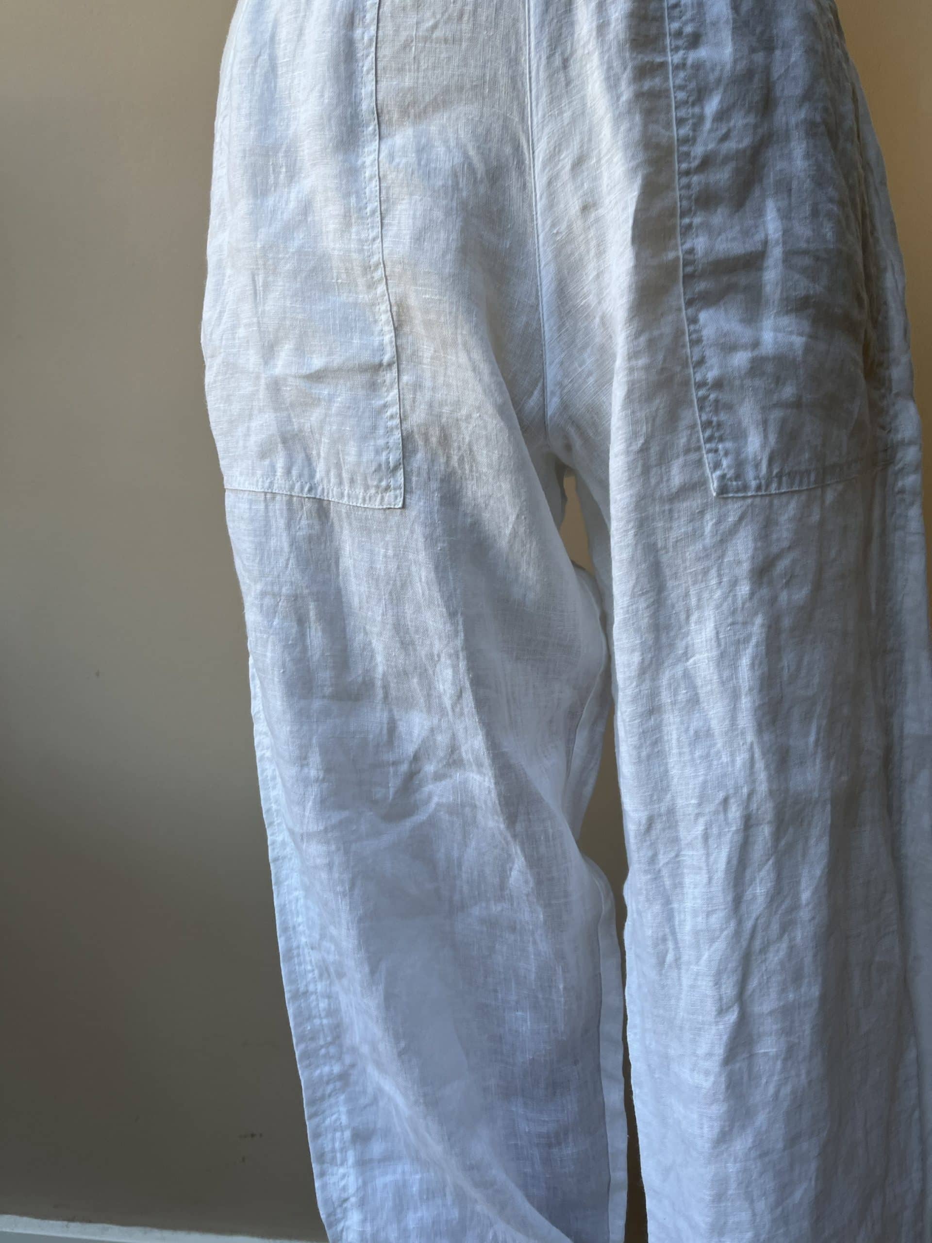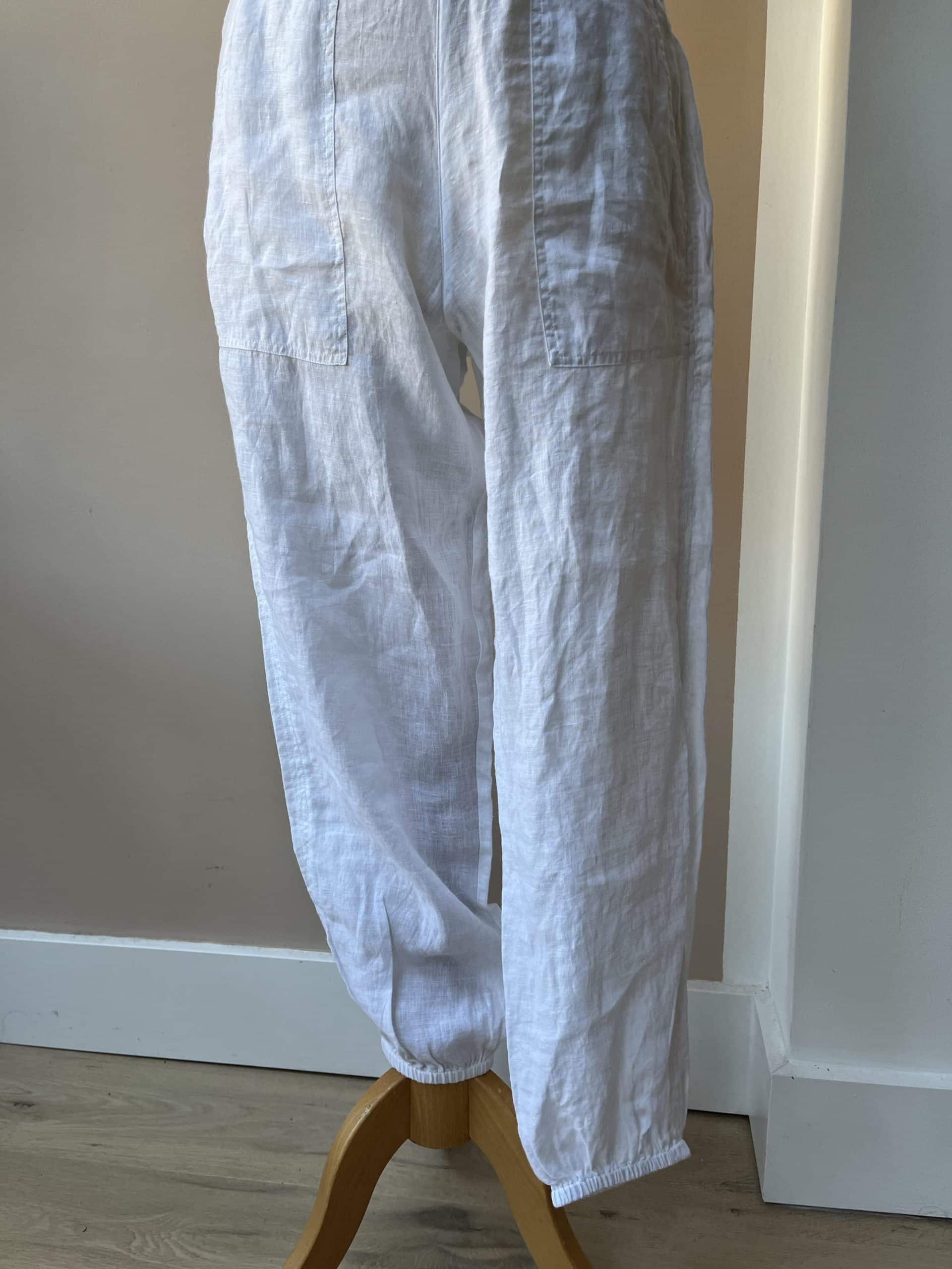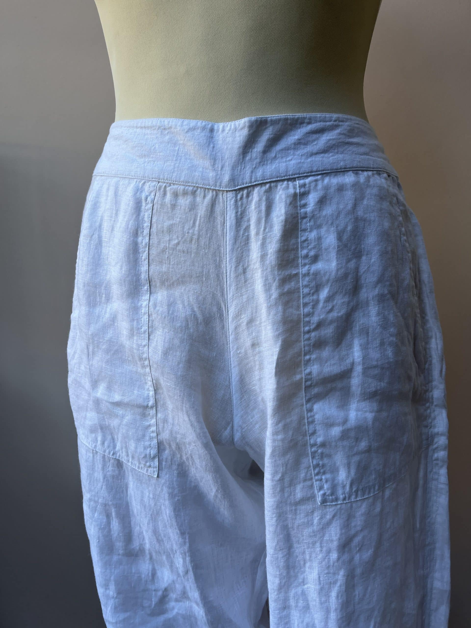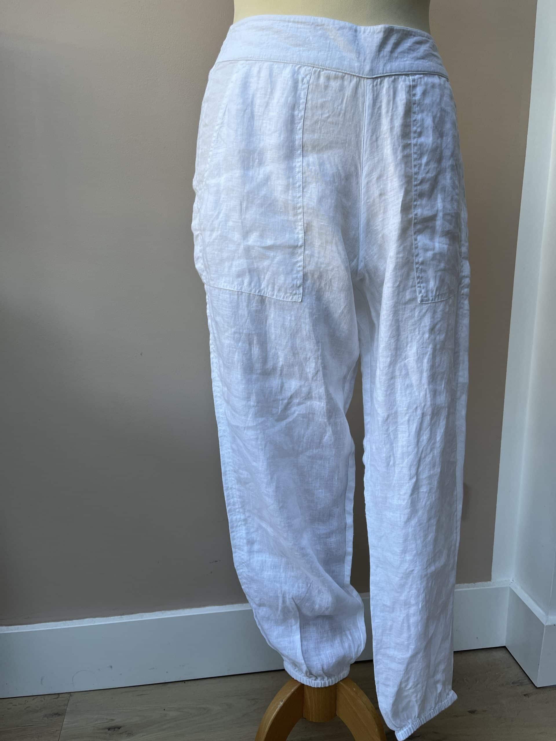 Lovely light white trousers, linen I think and about a size 10 (I think would fit an 8 too). Elasticated ankles, lovely shape. If these fit me, I would 100% be keeping them