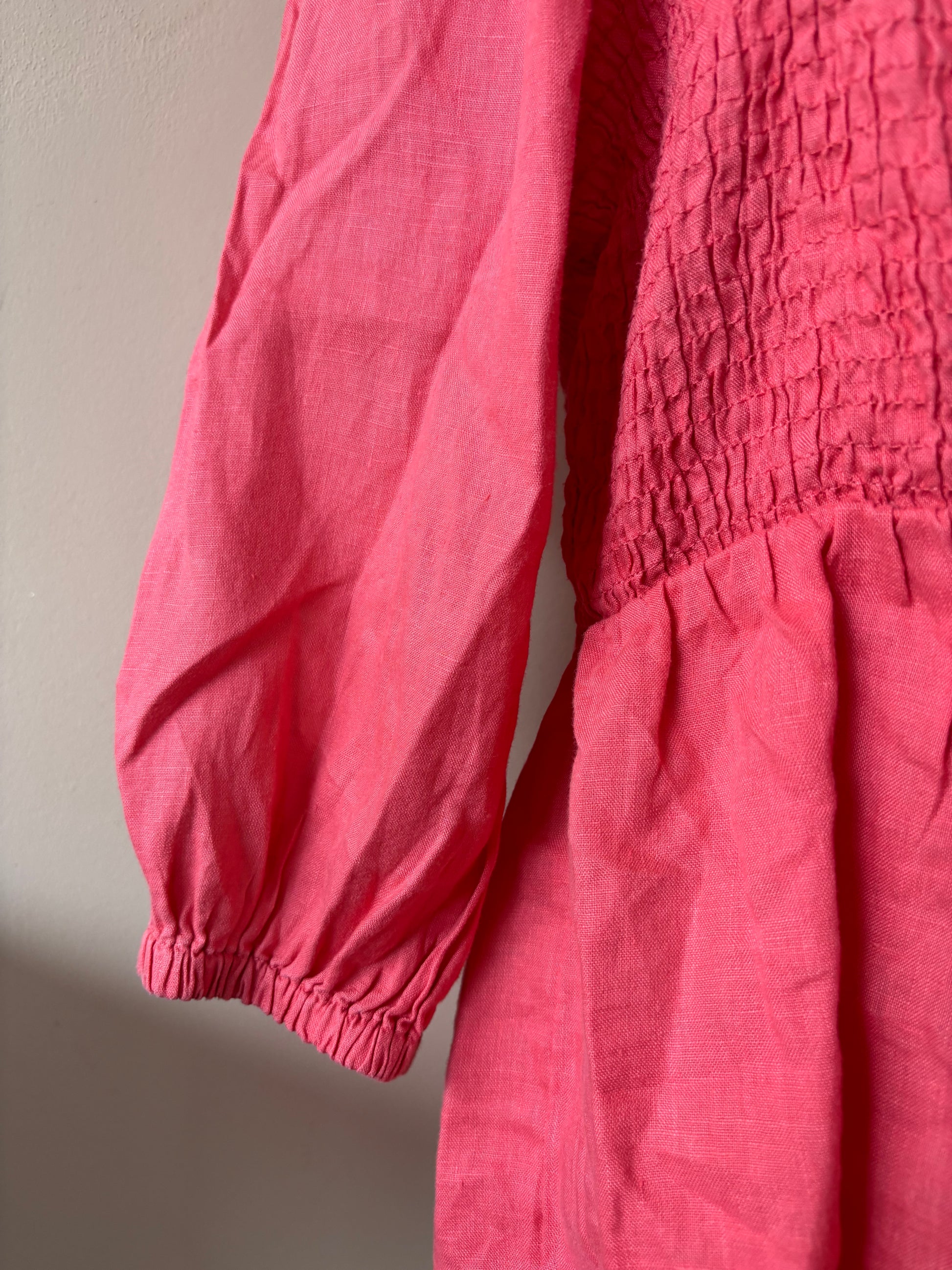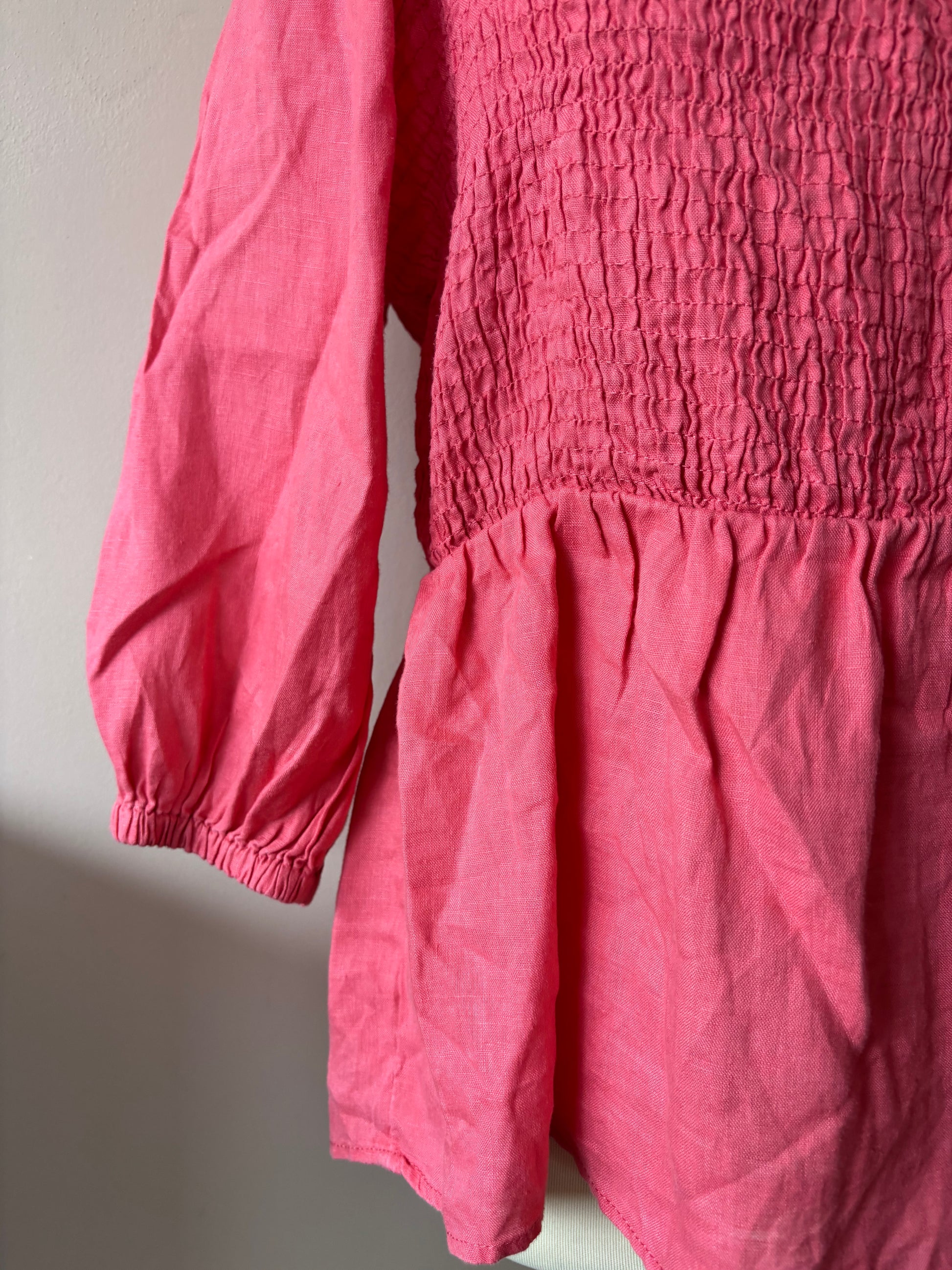 Pink 100% linen puff sleeve blouse with smocking size 16