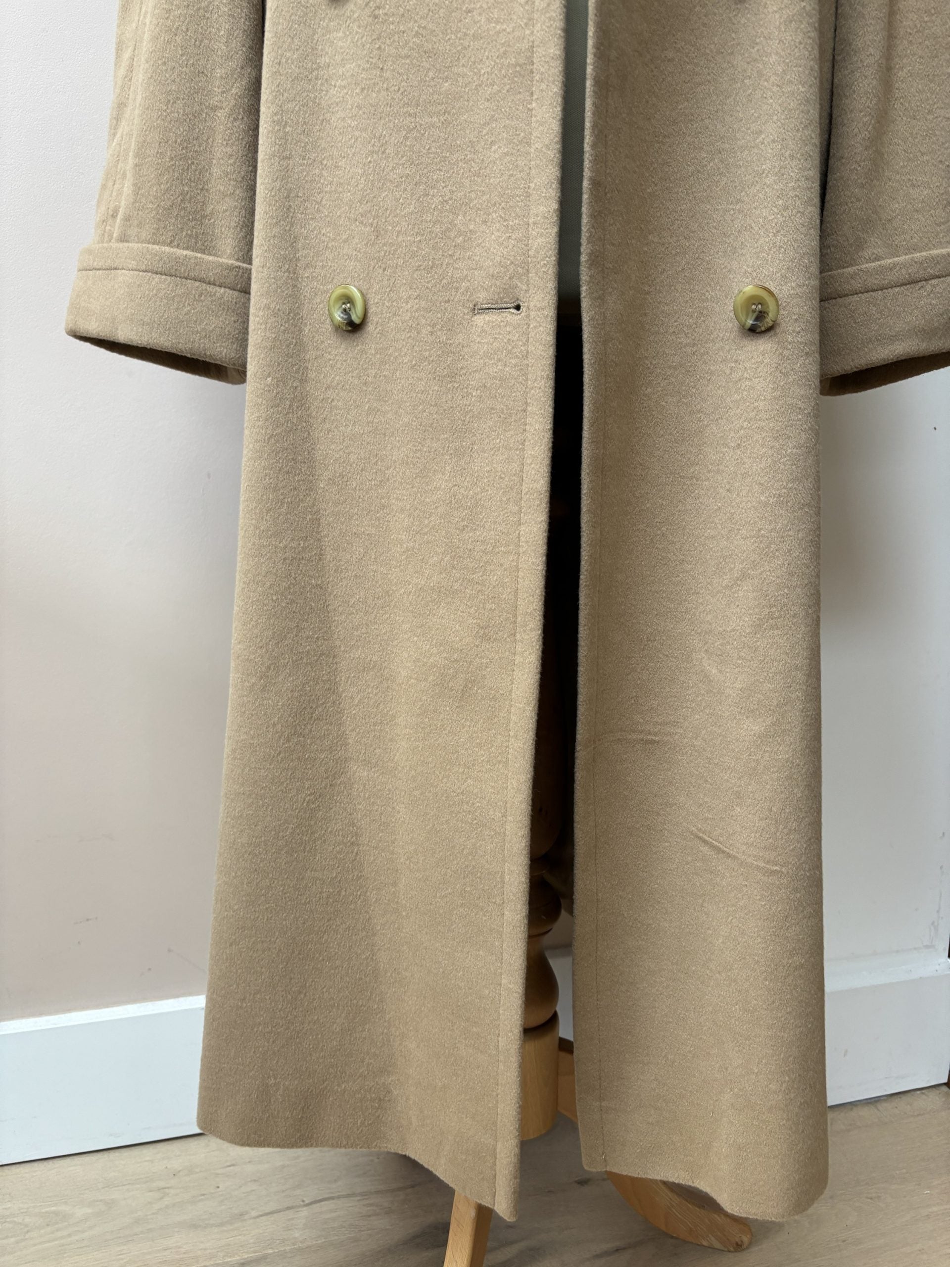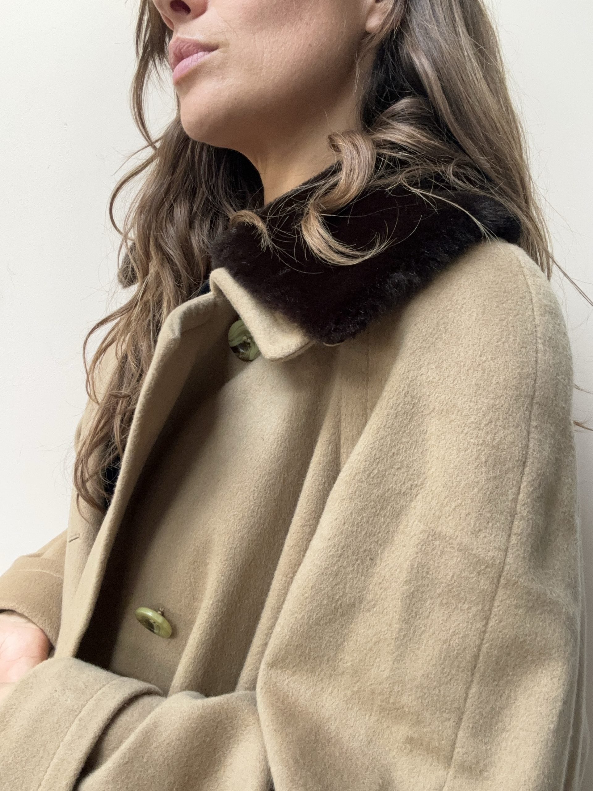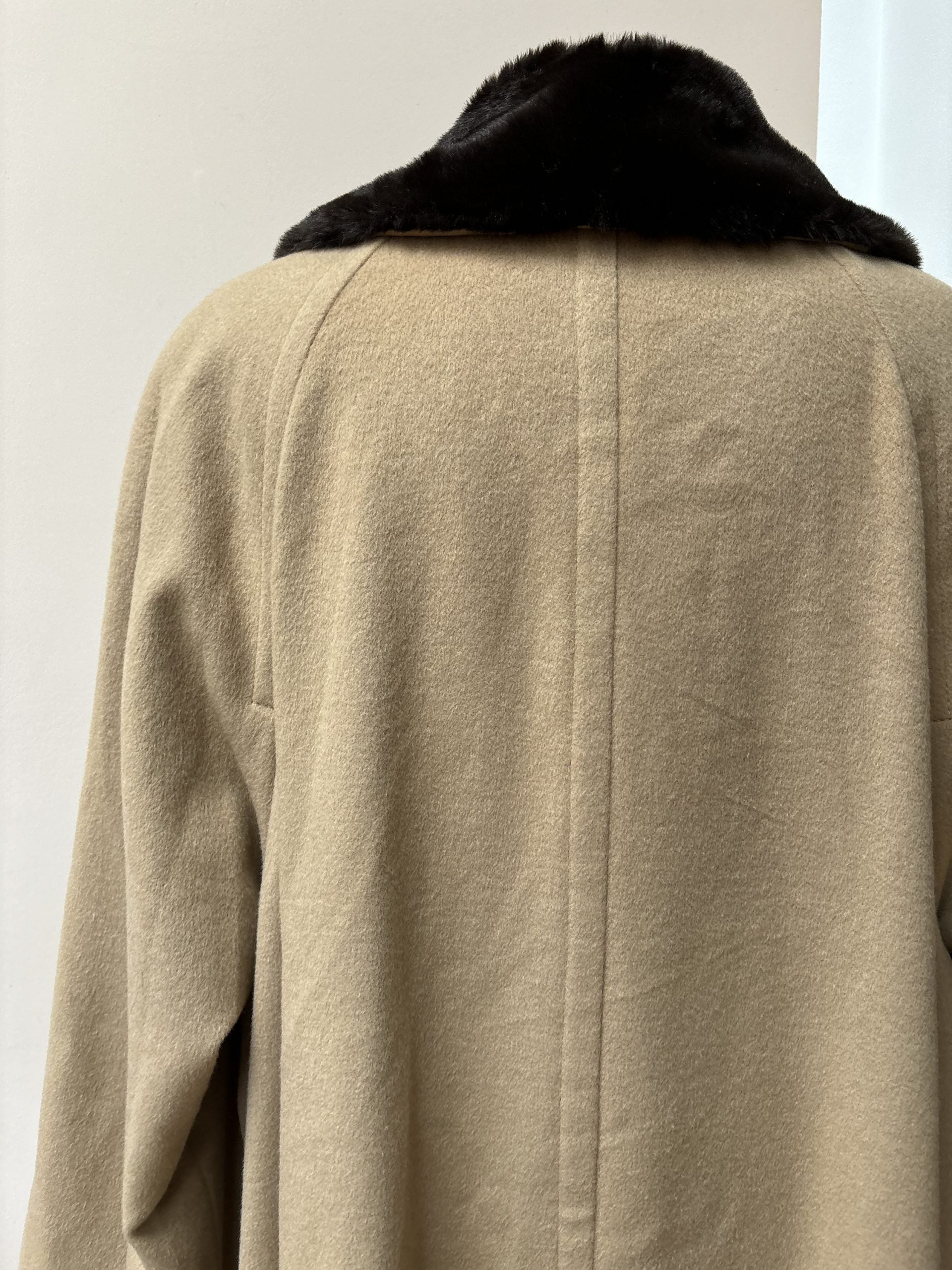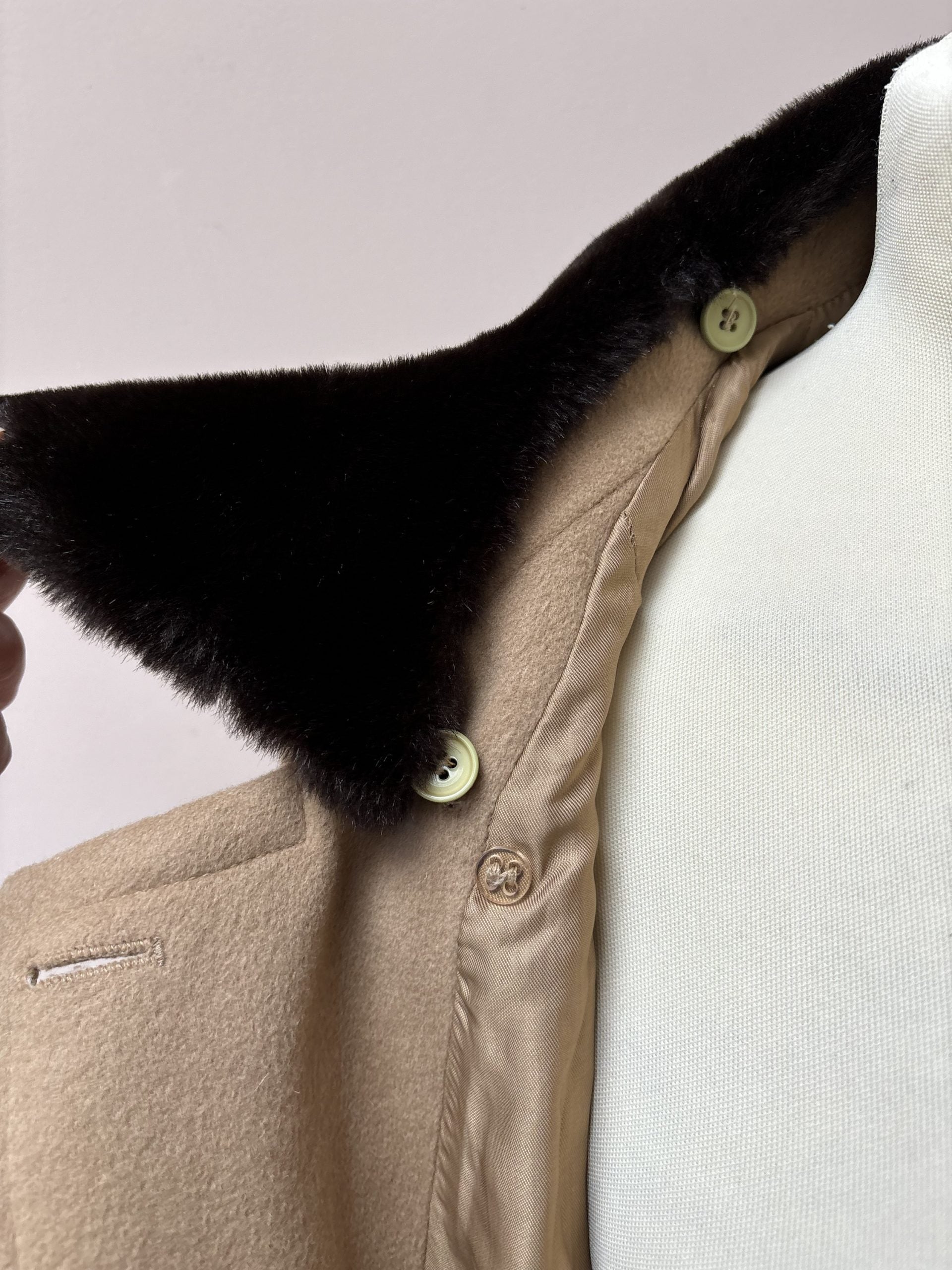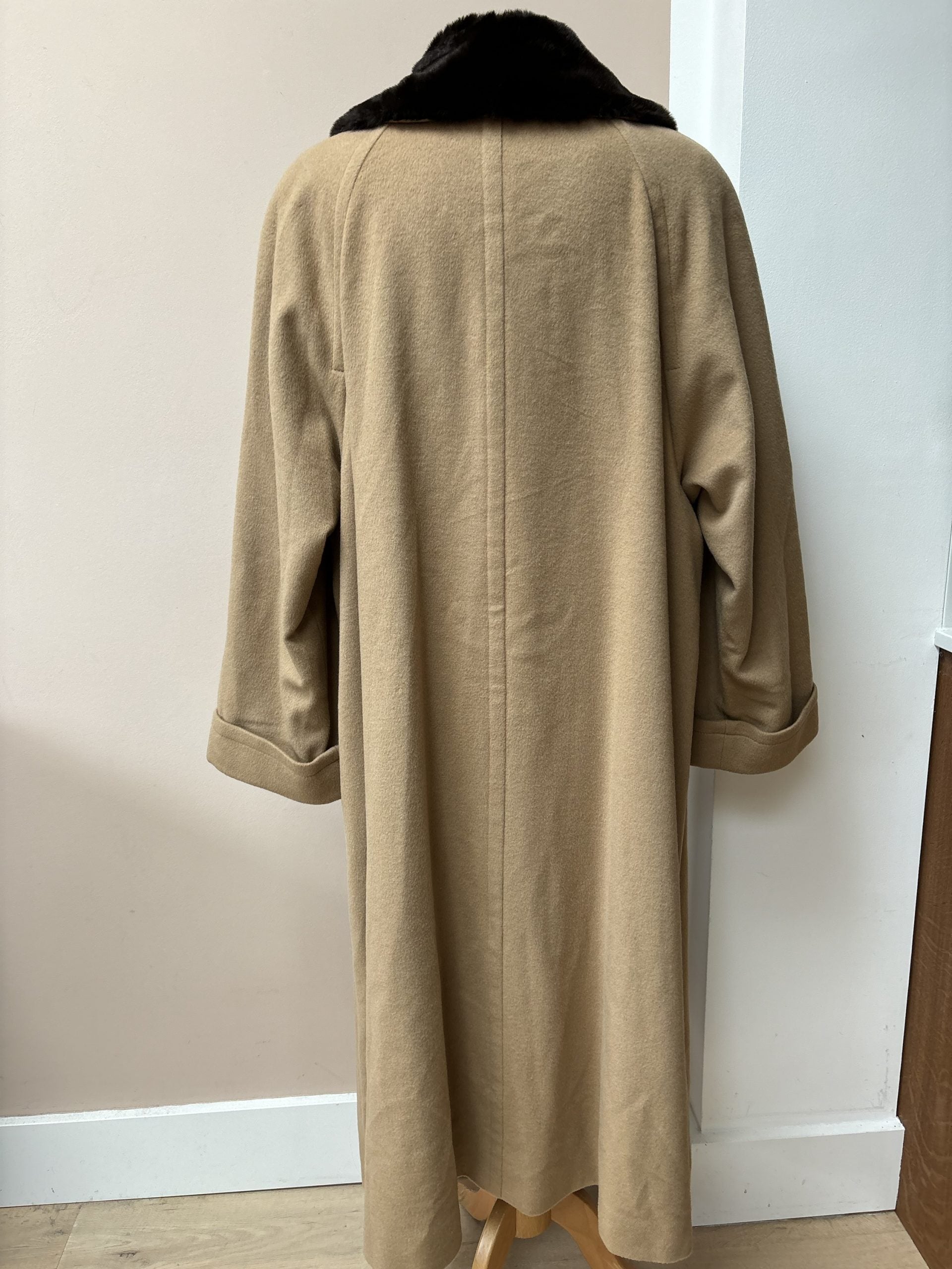 Vintage size 18 but I think would work size 14-18. This has a removable brown collar. Beautiful long length
