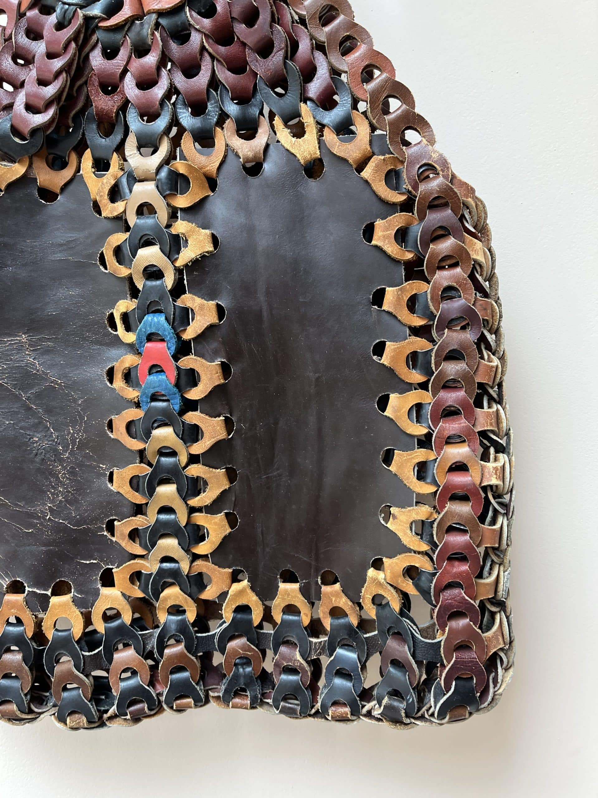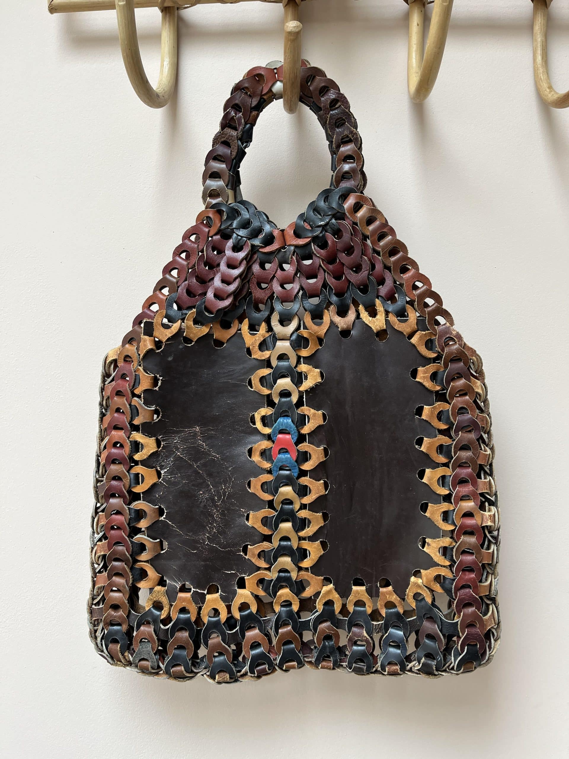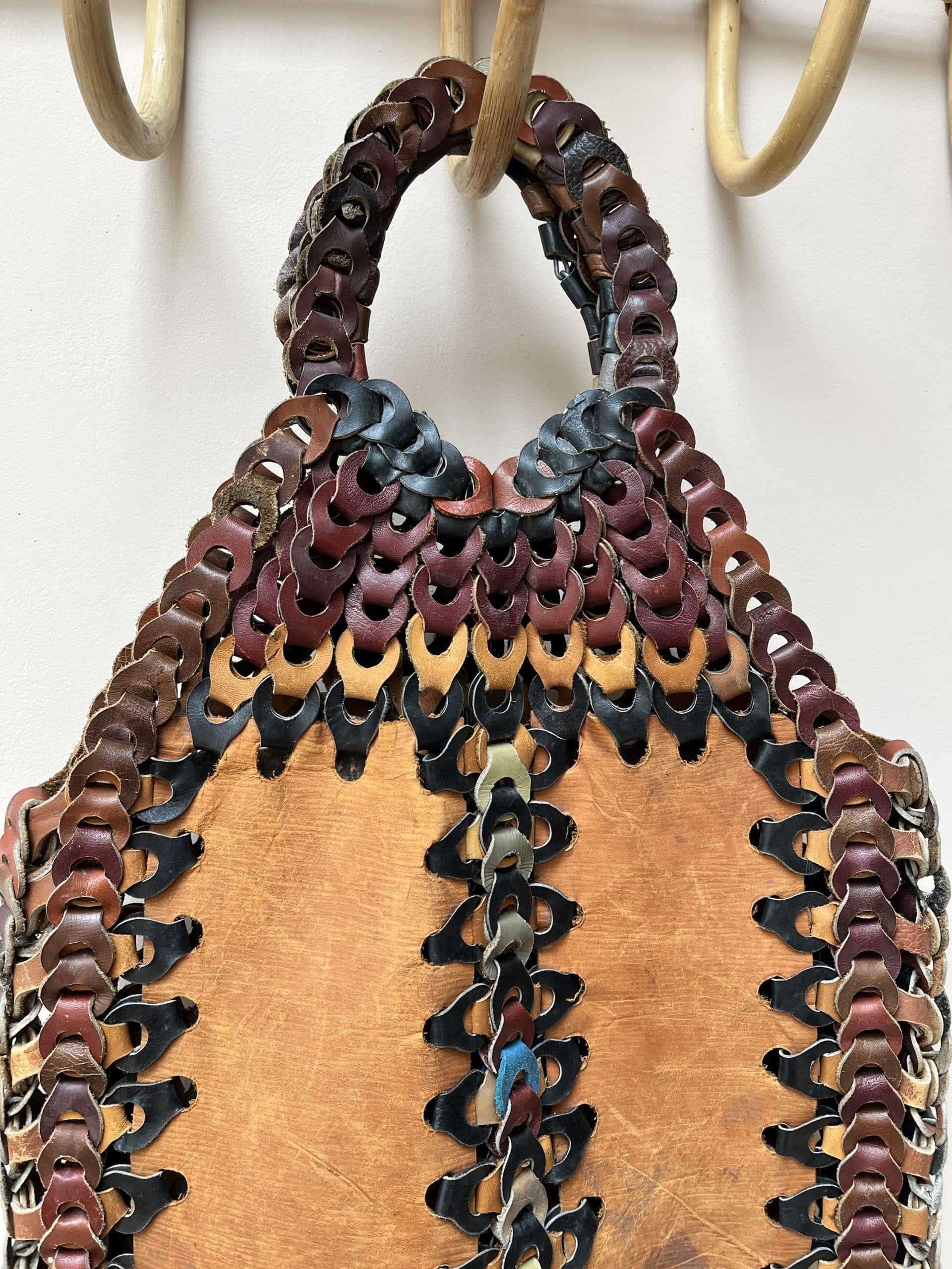Beautiful and totally unique woven leather bag. Each side is different. The dark brown leather panels have some light wear as you can see but still a totally stunning bag